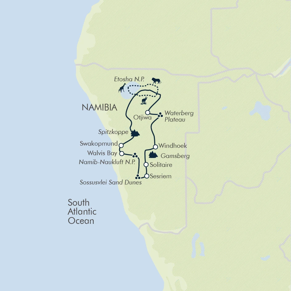 Namibia is a vast country with wide-open spaces and endless skies. Dunes gradually turn into granite hills, while rocky outcrops give way to vast plains where elephants, giraffes and lions roam. Travelling through the wilderness by bike is undoubtedly one of the best ways to experience the varied landscape of this desert nation and there is also the unique experience of cycling over dunes on a modified fat bike. Discover the highlights and hidden secrets of the country on two wheels, watch the sun rise over some of the tallest dunes in the world and experience game drives in one of the best game reserves in southern Africa, Etosha National Park.