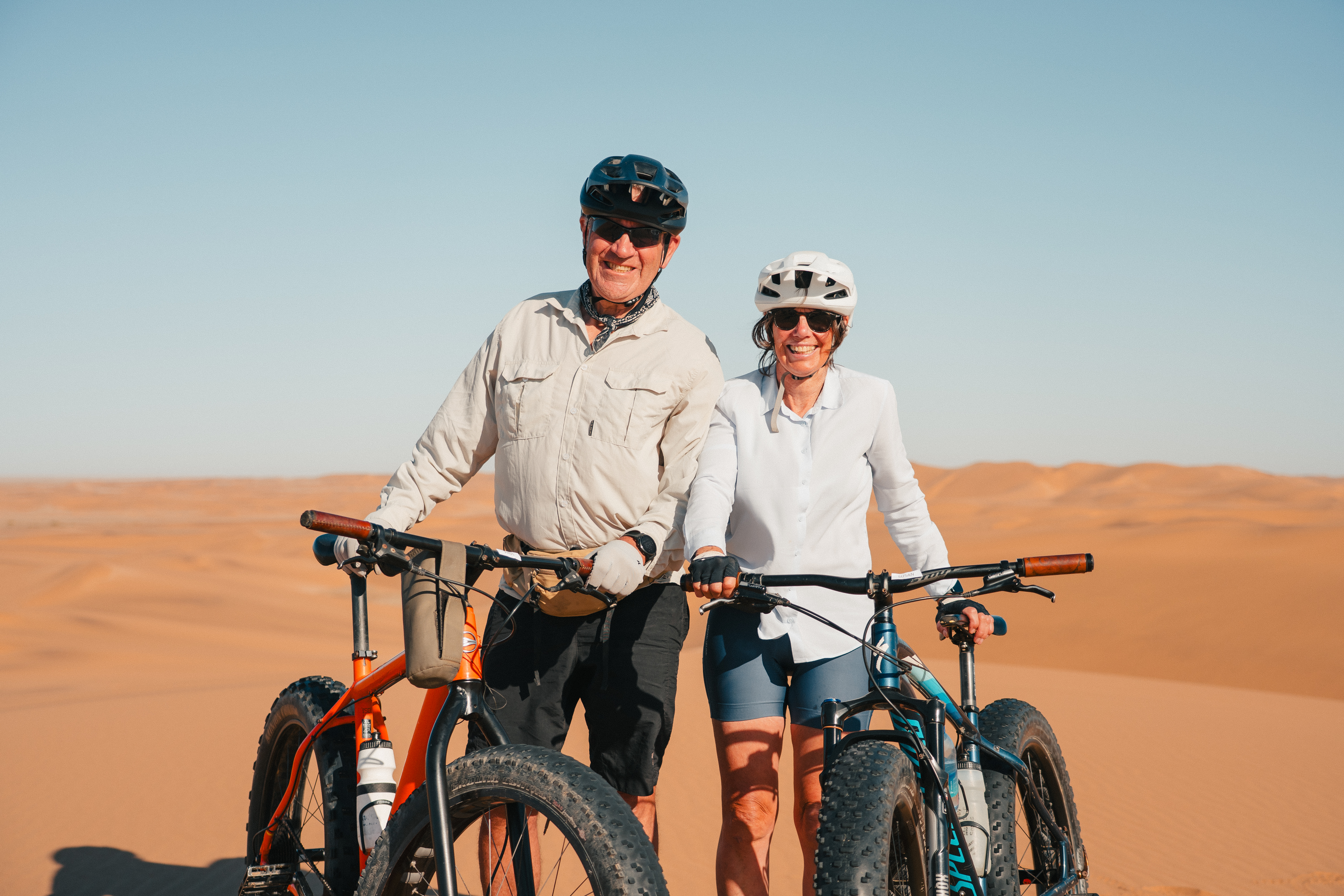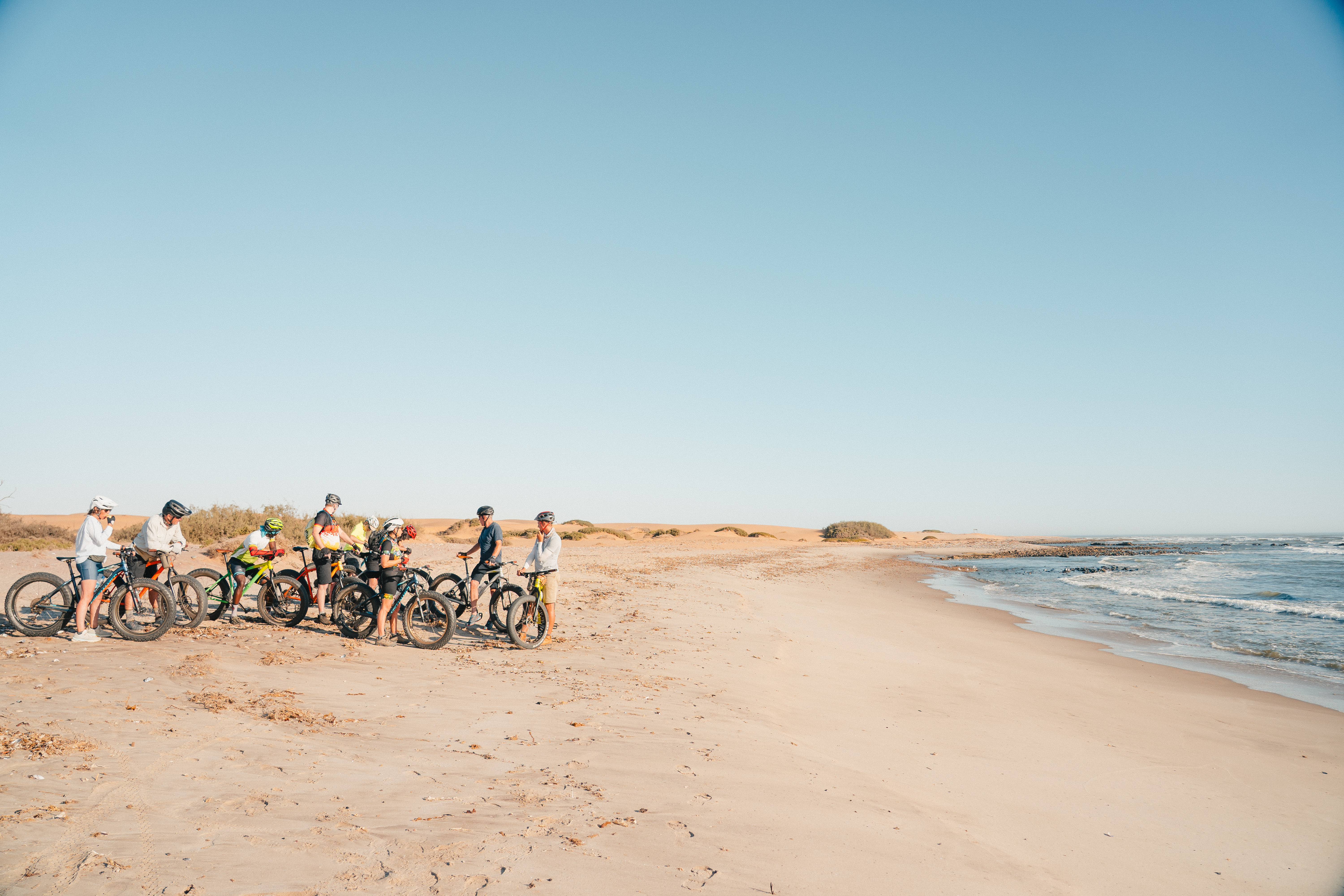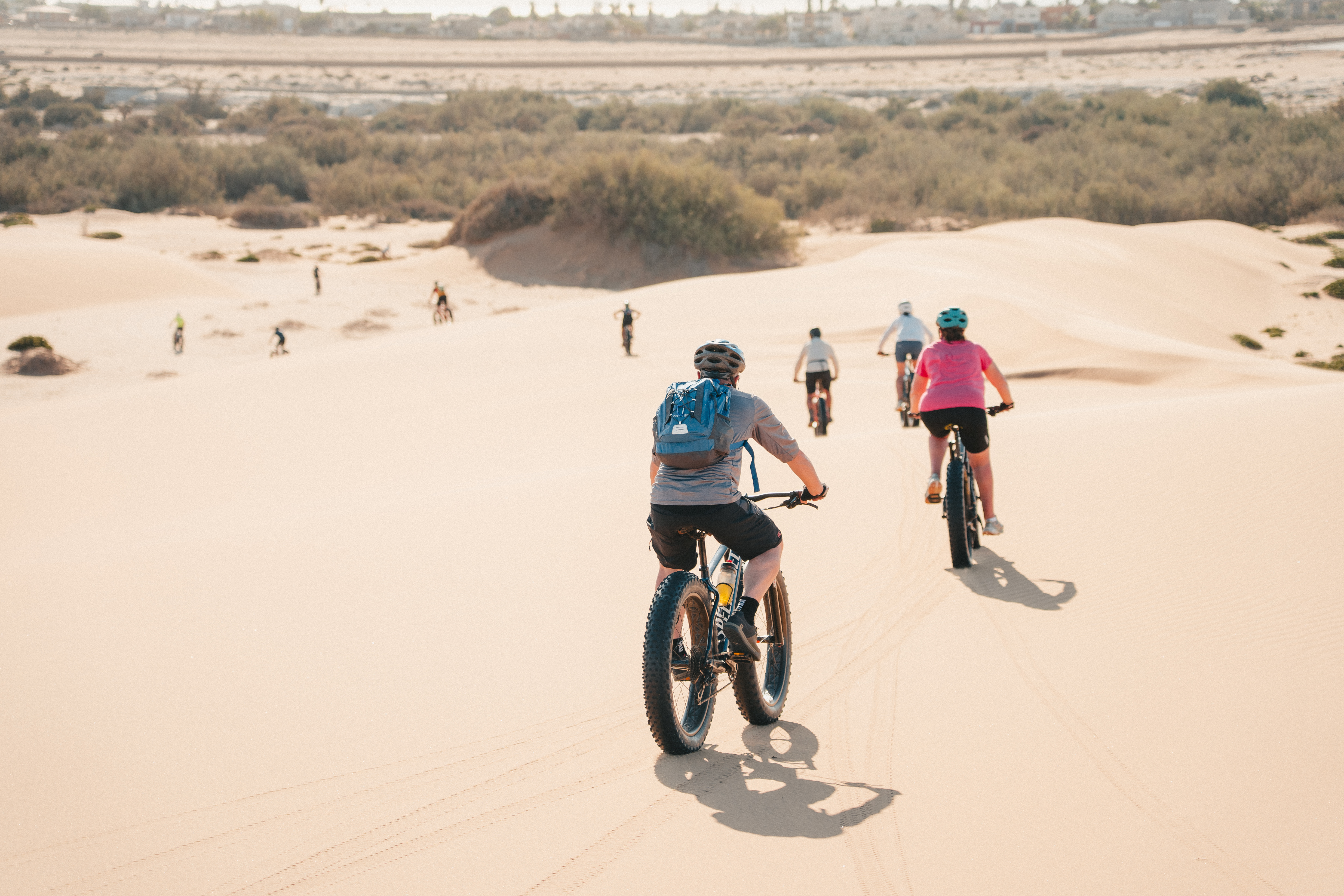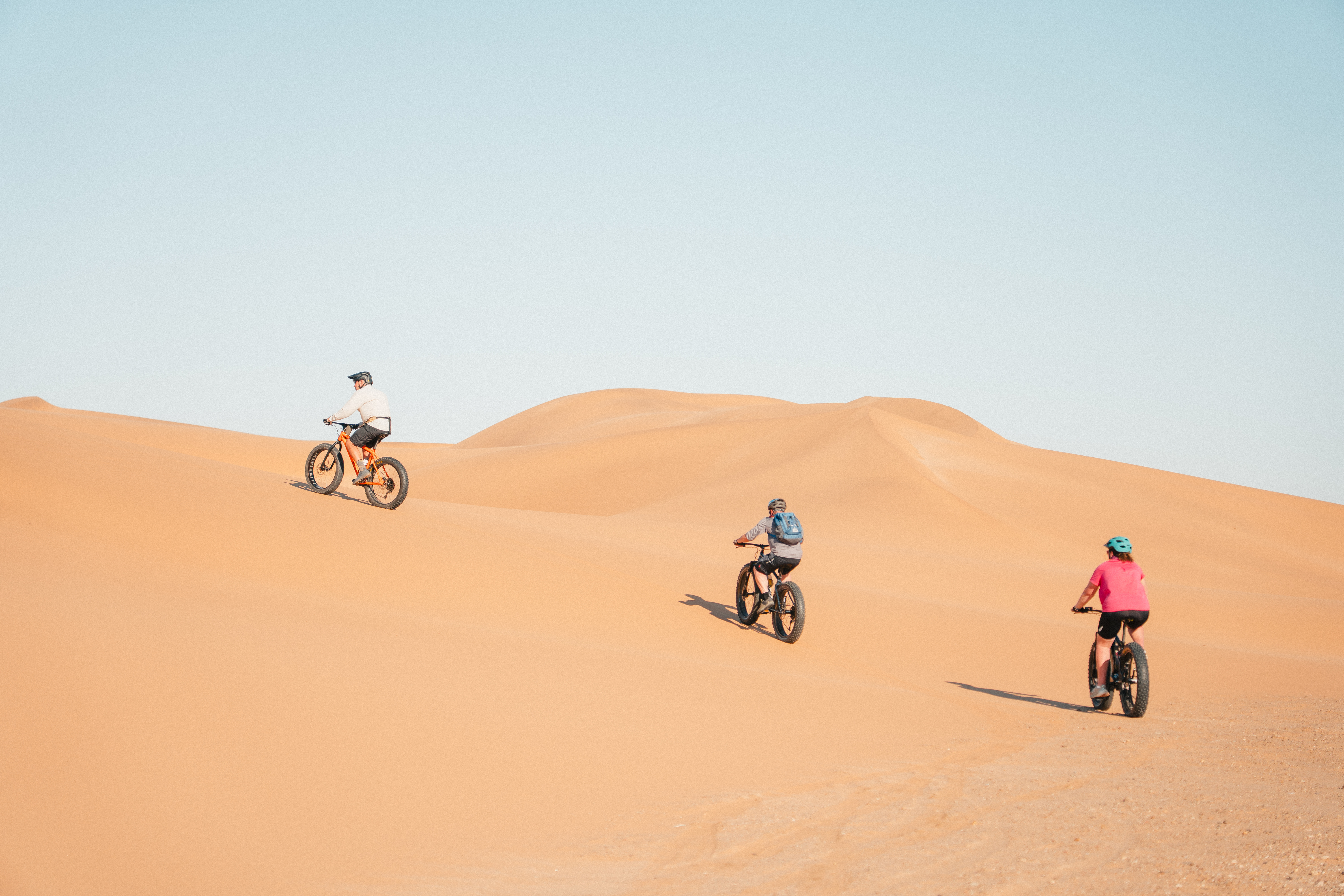 The fat biking on dunes is with a specialist guide and on modified bikes. These are mountain bikes fitted with extra large tyres, making it easier to ride on sand and distributes the rider's mass across a larger area, enabling more traction and stops the bike from sinking into the sand. You receive a tutorial before setting off but no experience is necessary. The terrain is rolling and you have the opportunity to cycle some steep gradients down the dunes. However, there is always the option of cycling down a gentler slope.