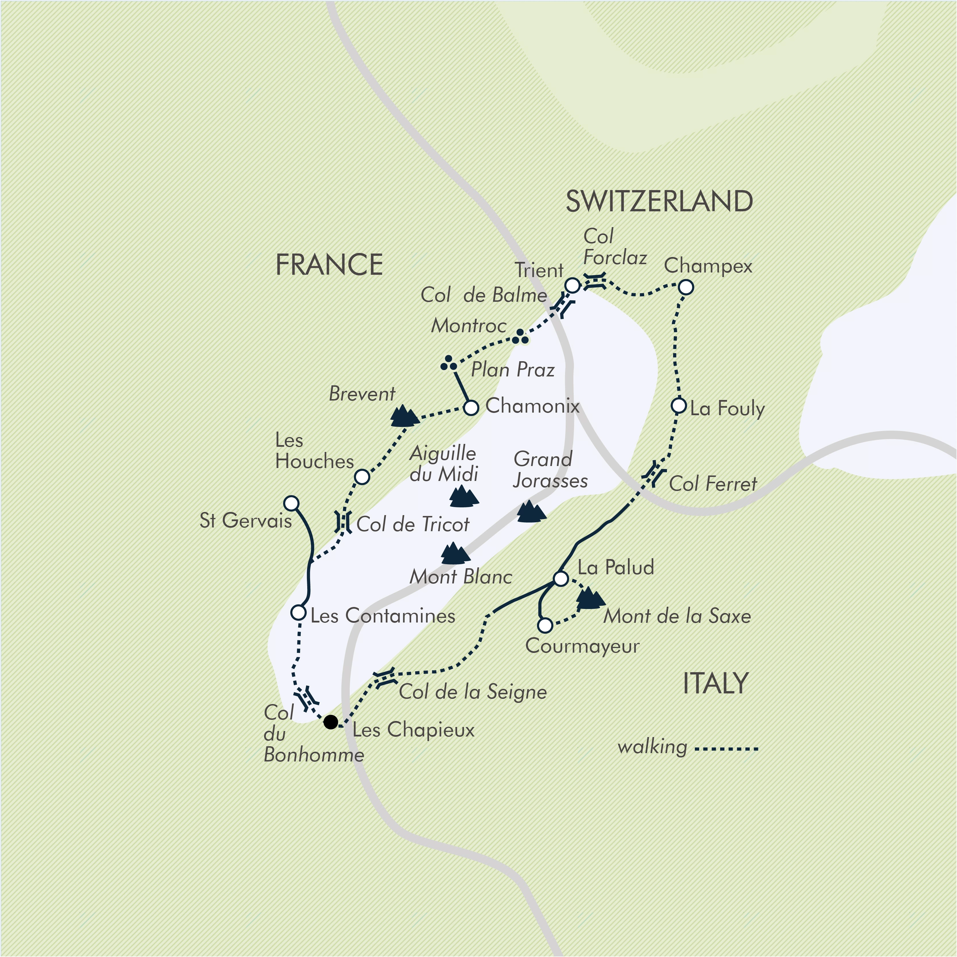 If you enjoy the comfort of a bed every night, we offer the Mont Blanc Circuit as a fully accommodated walking holiday, with all nights spent in a variety of lodgings from family-run two- and three-star hotels to basic inns or pensions. We include 10 walking days and three rest days, in which we cross the borders of Switzerland, Italy and France and enjoy unrivalled views of the Alps and Mont Blanc itself. Overall the trekking will feel tough with long walking days but the three rest days are incorporated to give you time to rest the legs whilst enjoying three fascinating alpine towns. Courmayeur is an old worldly Italian gem with windy pedestrian streets lined with chic shops and delightful cafes, bars and restaurants. A short, free, bus ride away is the luxurious QC Therm Spa and wellness centre, a lovely treat. Les Contamines and St Gervais are charming alpine towns with interesting local markets, electric bike hire and gondoliers taking you up to stunning view points. The last free day is in Chamonix, the vibrant heart of the Mont Blanc massif, with a wide choice of activities to try, including paragliding and taking the Aiguille du Midi cable car up to 12,605ft (3,842m) for spectacular, close-up views of Mont Blanc. The itinerary follows the same route as our camping version (trip code TWB). With your qualified International Mountain Leader (IML) guiding the way, you will complete the famous circuit, and your baggage is transported for you by our support vehicle. In most places, we use a hotel for just one night, before moving on the next day; occasionally we settle in for a few nights and use local transport to take us to the next point of the circuit.