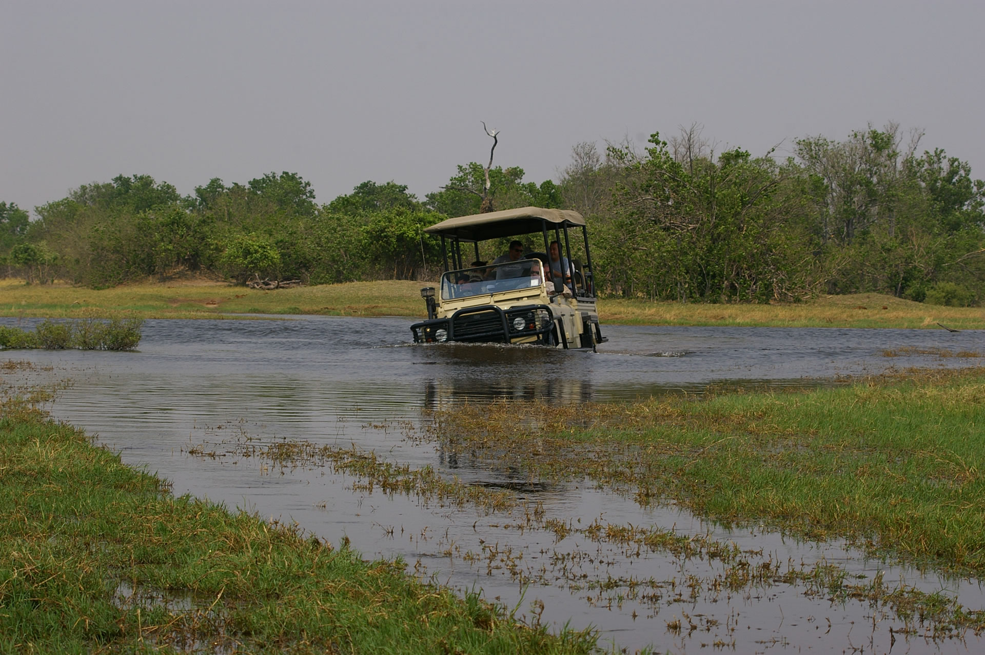 Definisjonen av Overland; Overland (of travel) accross the land in a vehicle, on foot or on a horse; not by sea or air"