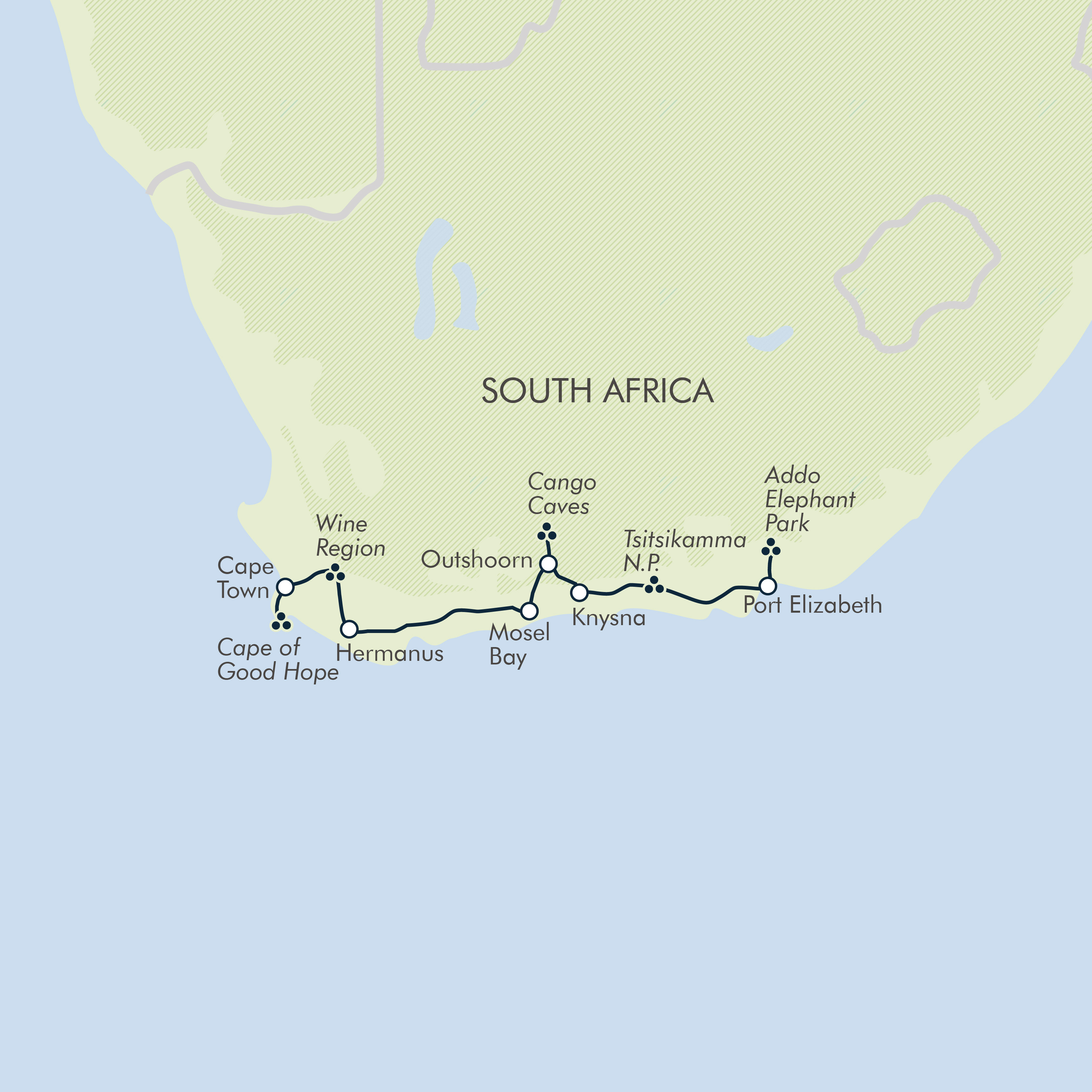 Walks: This is primarily a vehicle-based adventure, although we can take walks in Tsitsikamma National Park, Meiringspoort Waterfall, Hermanus and Cape Point Nature Reserve. These are generally along good paths and boardwalks and take about one to two hours.