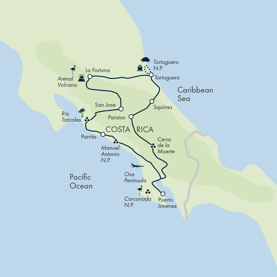 Immerse yourself in the tropical scenery of Costa Rica by bike… there’s no need to hurry when the views so spectacular. Guided by a tour leader with unrivalled local knowledge, you’ll witness an ever-changing slideshow of idyllic coastlines, coffee farms, towering volcanoes and more. But this cycling adventure goes far beyond breathtaking scenery. Off the saddle, you’ll dive into the country’s rich wildlife and culture, gliding along Tortuguero’s wildlife-filled waterways, wandering through the botanical wonders of Las Cruces, and tracing ancient lava fields at the foot of Arenal volcano.
