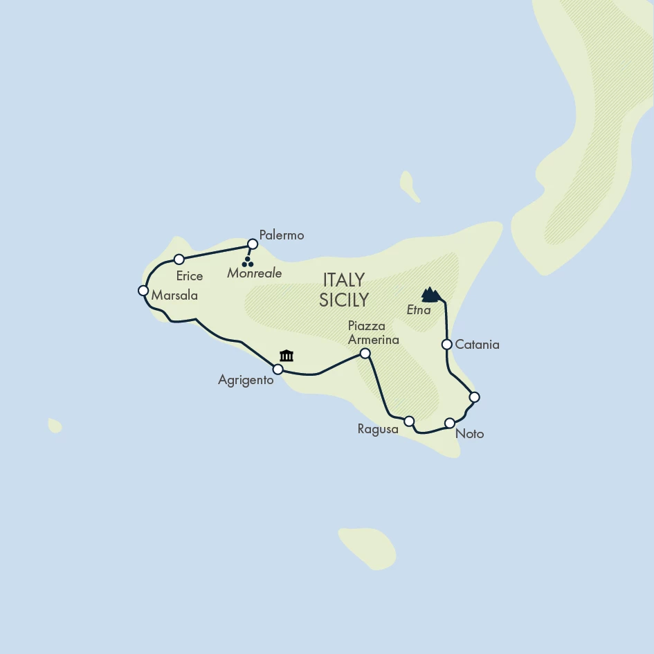 This is a very relaxing week where you can enjoy excellent regional gastronomy while visiting the most important heritage sites and towns in Sicily. All the transfers are by private air-conditioned vehicle. Due to the distance covered during the week, some of the drives are quite long but should never exceed four hours (including stops). Due to traffic restrictions in a lot of the historic centres visited, you may have to carry your suitcase over cobbled pavements, although the bus will leave you as close to your hotel as possible. When this is not possible, a porterage service is provided, which has been included in the cost of the trip. Please be aware that some hotels don’t have a lift.