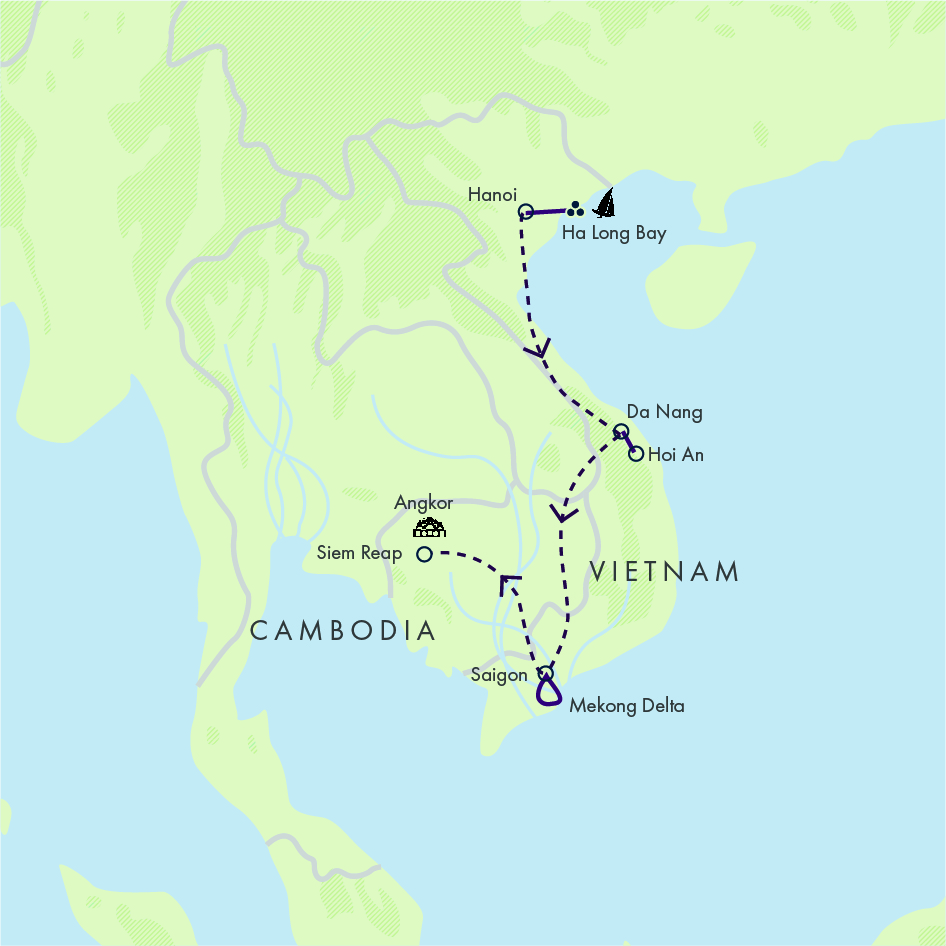 Immerse yourself in incredible experiences on this expertly led cultural adventure from Hanoi in northern Vietnam to Siem Reap in Cambodia. Explore limestone cliffs and enjoy sundowners on deck as you cruise Ha Long Bay; discover culture and history in Hoi An; witness street life in vibrant Ho Chi Minh City; and slow down on the serene waterways of the Mekong Delta. Finally, we journey to Siem Reap, staying at the intimate Lynnaya Urban River Resort & Spa – the perfect base to visit one of the great surviving archaeological wonders, the iconic temple complex of Angkor.