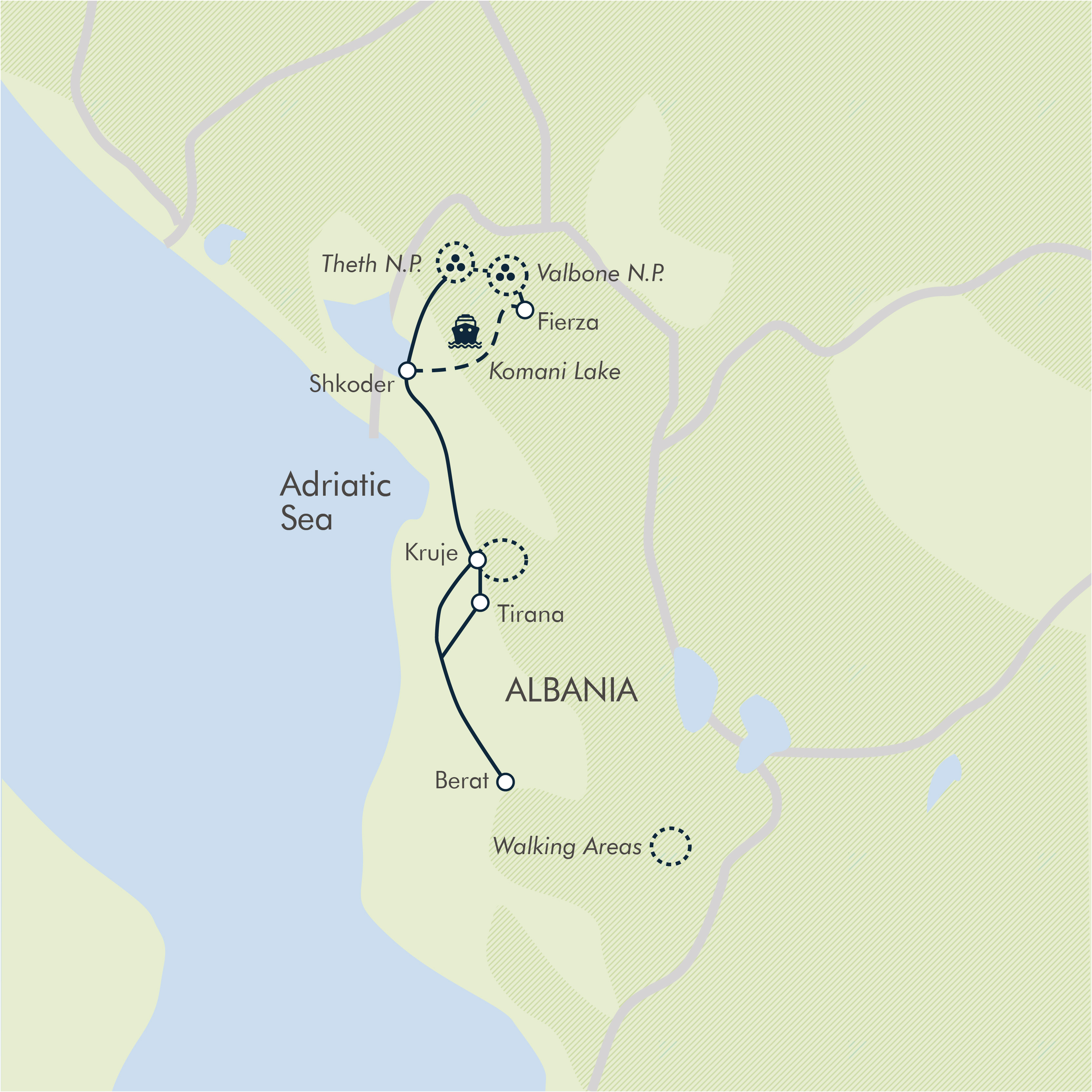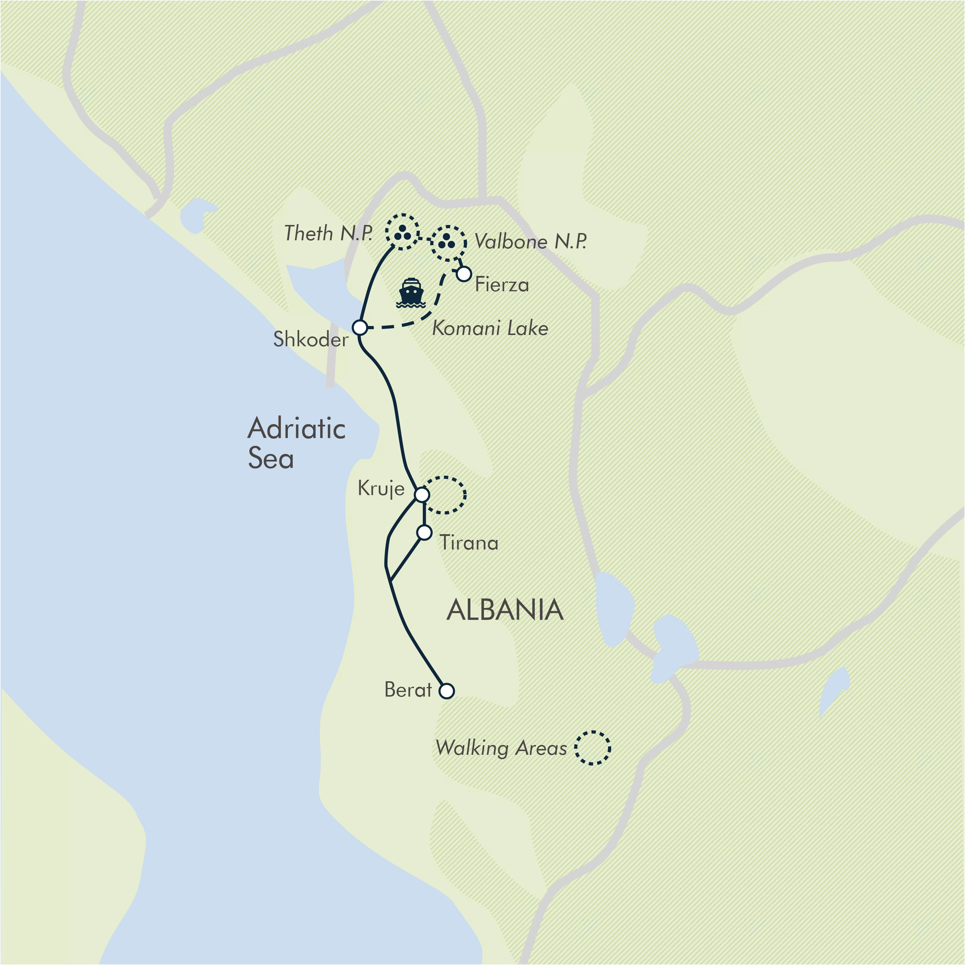 Over the course of the week, we enjoy five walks of varying length. There are three spectacular full-day walks of up to about seven hours of walking per day, and two shorter walks each of roughly one to three hours (including stops). Walking hours stated are given as approximates only. The remainder of our time is spent sightseeing in Berat and Krujë.